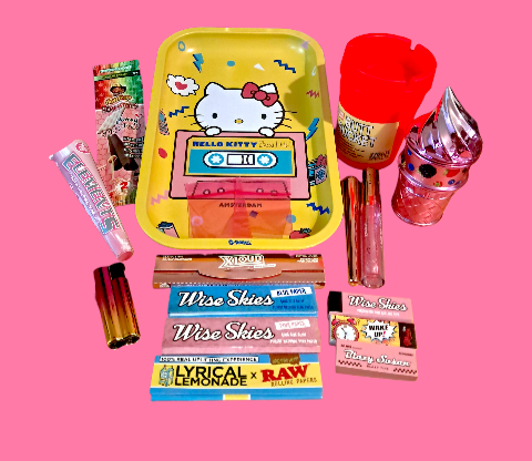 Have a rolling good time with this Large Hello Kitty Rolling Tray Set! Includes a G-Rollz Hello Kitty(TM) Medium Metal Tray, Ice Cream Shape Herb Grinder, Atomic Joint Tube, and more. Keep it cute with Wise Skies Pink Papers. Don't forget the Sunkissed Shimmer Queen Lip Gloss and Flamejack Lighter for a complete sesh.